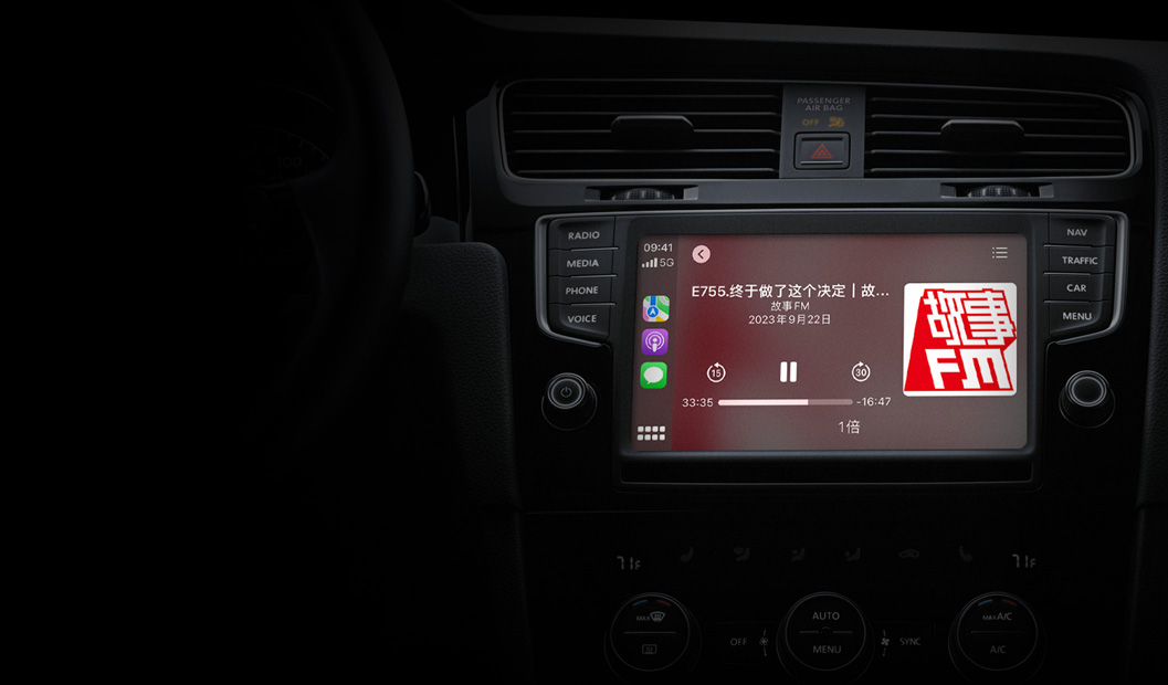 CarPlay 车载可让你将 iPhone 连接到车载中控屏,目前已有超过 800 款车型支持这项功能。这样你就可以轻松使用车载触控屏或 Siri 来访问 Apple 播客。特定车型还预装了 Apple 播客。
