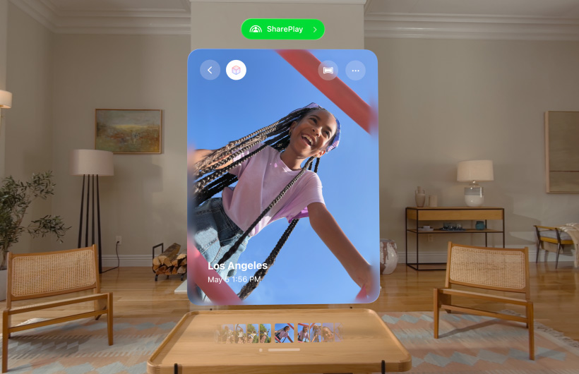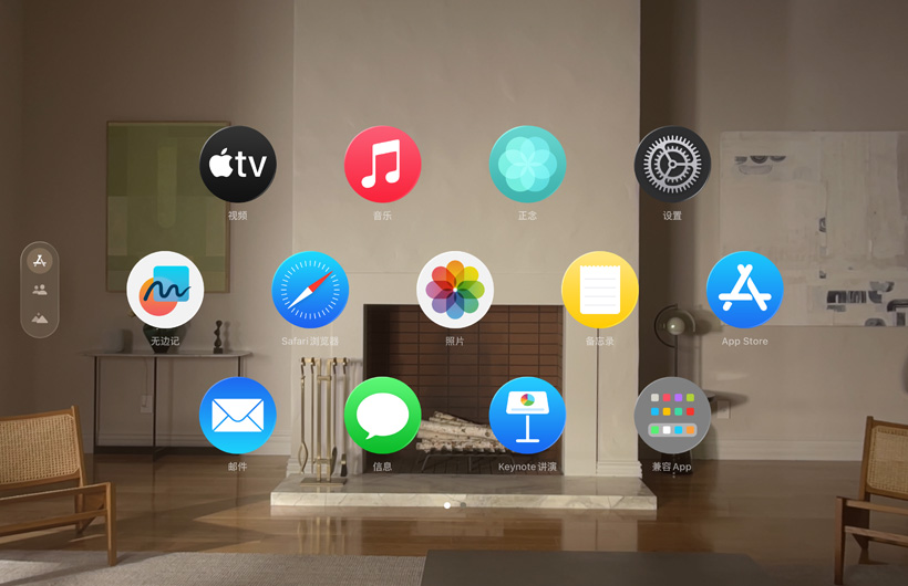 在 visionOS 中,app 可以摆放在你周围的空间里,完全不受显示屏的限制。你可以随意移动这些 app 的位置,随心缩放尺寸,它们还会随你房间的灯光变化产生反光或阴影。