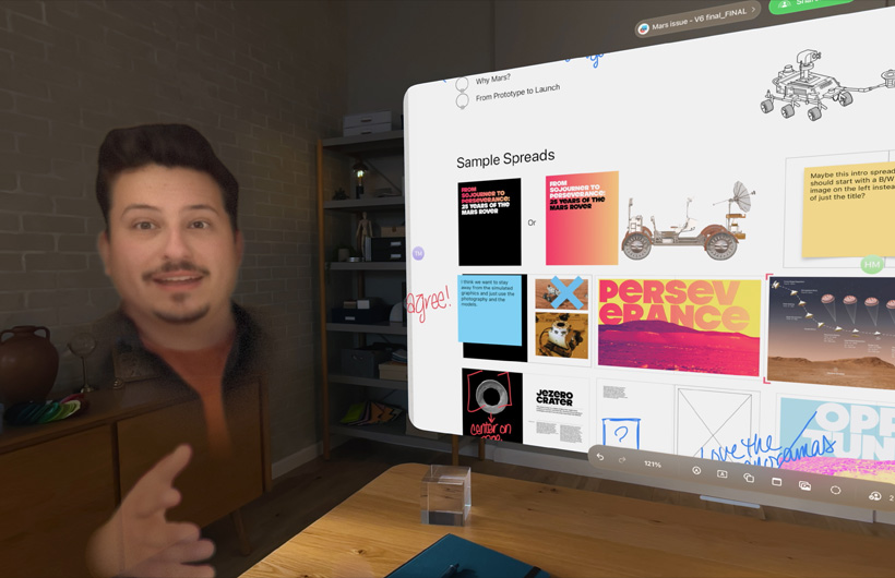 Apple Vision Pro 能将 3D 物体栩栩如生地呈现出来。你可以直接从 app 中拖一个 3D 物体出来,从各个角度观察,仿佛它就在你眼前。